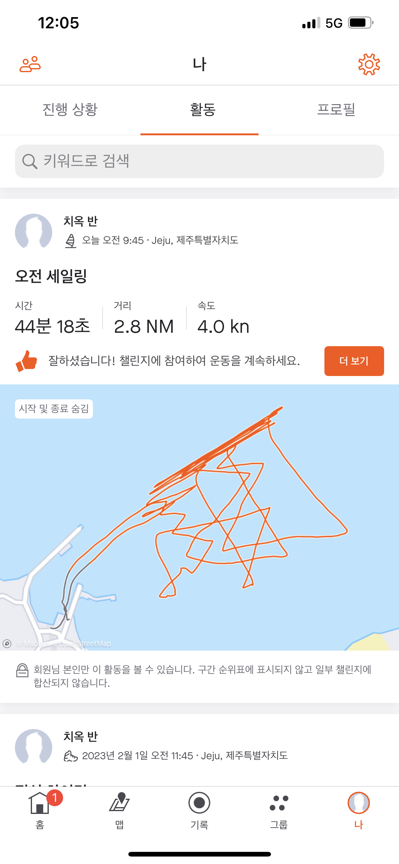 구해줄 수 없으니 조심해서 타라는 코치님의 당부도 있었고, 이 바다에서 한 번 뒤집히면 제법 고생을 할 것 같아서 겁도 많이 났다. 항을 많이 벗어나지 않고 조심해서 타다가 결국 한 번 빠졌다. 배가 뒤집힌 것은 아니고, 잠시 정신을 놓은 사이에 발이 안 걸리면서 빠졌다. 다행히 물은 생각보다 차갑지 않았고, 메인시트를 잡고 있어서 금방 다시 올라왔지만 놀란 마음이 좀처럼 진정되지 않았다. 우선 배를 바람 방향으로 세워서 잠시 숨을 돌리려고 했는데 파도가 높아서 그마저 쉽지 않았다. 잠깐 더 타고 서둘러 귀항했다.